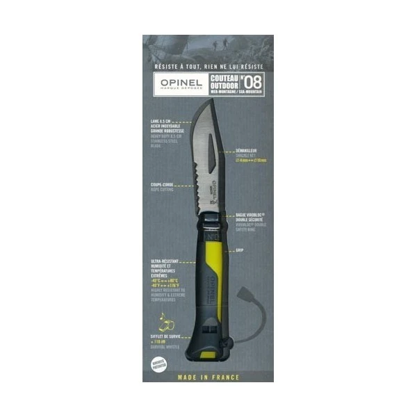 Découvrez le tout dernier couteau Opinel, L’Opinel Outdoor avec manche vert, lame de 8,5cm d’une épaisseur de 2,5mm pour une grande résistance dotée d’une zone crantée de 3,5cm pour couper durablement et sans effort, les cordes naturelles et synthétiques, pourvue d’un démanilleur (manille de 4 à 10 mm).