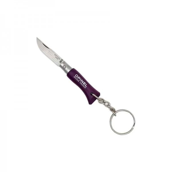 Véritable porte-clés Opinel couleur violet avec lame inoxydable. Manche en hêtre sans bague de sécurité.